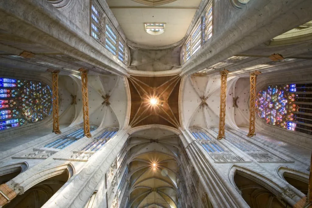 The interior of Notre-Dame uses a six-part rib vault, an older and heavier system than what would follow at Chartres. The vault therefore distributes the weight of the roof across six sections per bay rather than four, which meant thicker walls and smaller windows in the upper storeys.